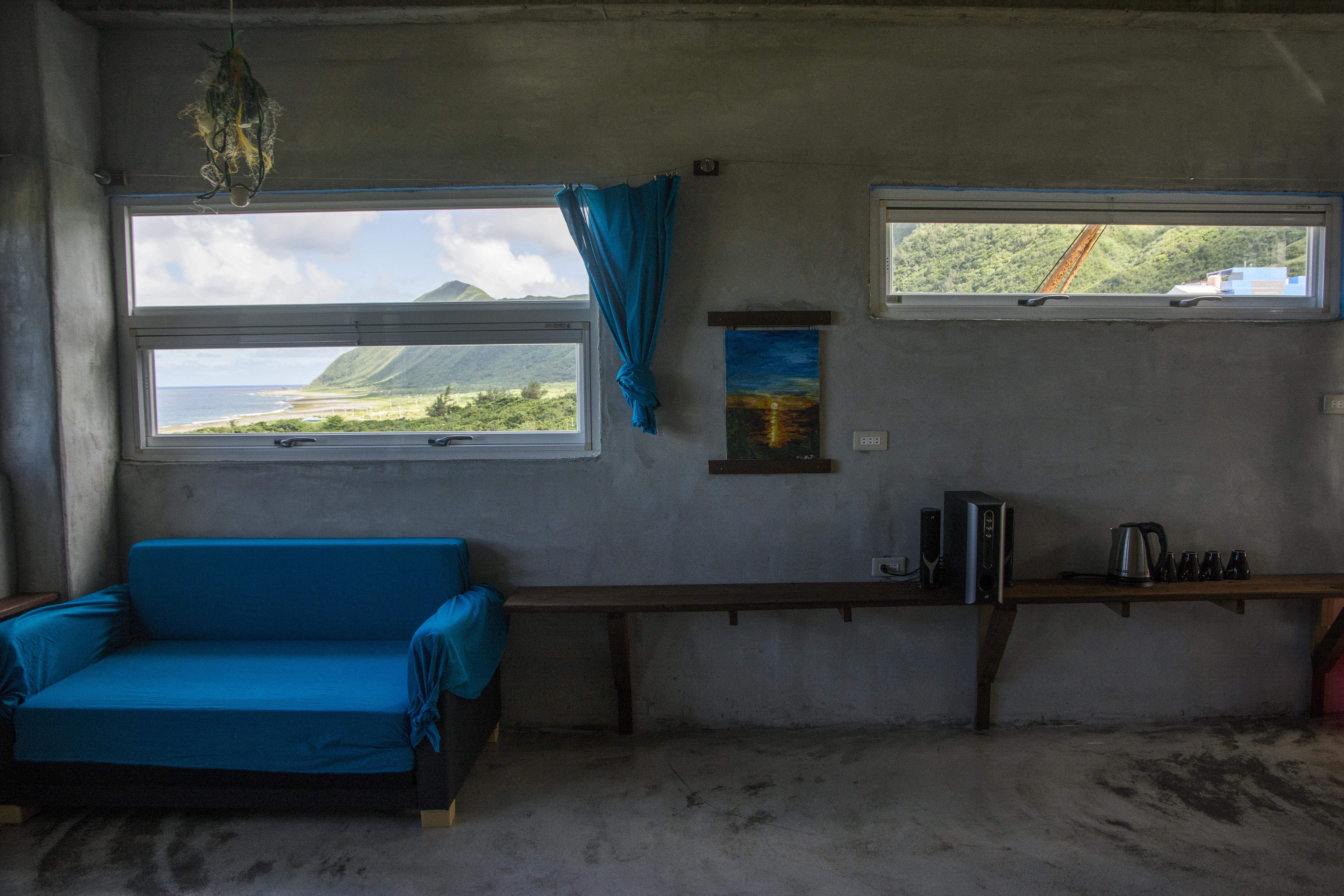 走進房內眼前最吸引人的是窗外蔚藍的海和房內板模遺留下的痕跡